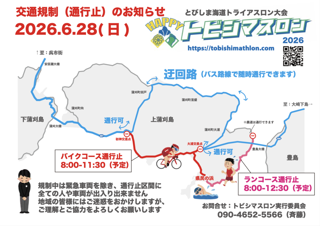 6⽉22⽇の8:30〜12:30(バイク区間 8:30〜11:30)までの間、コース全体、または⼀部を交通規制いたします(予定)。交通規制中は⼀般⾞両の出⼊りは出来ませんのでご注意ください。